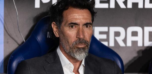 Eduardo Domínguez, técnico do Estudiantes, durante jogo contra o Flamengo na Libertadores Imagem: Ruano Carneiro/Getty Images