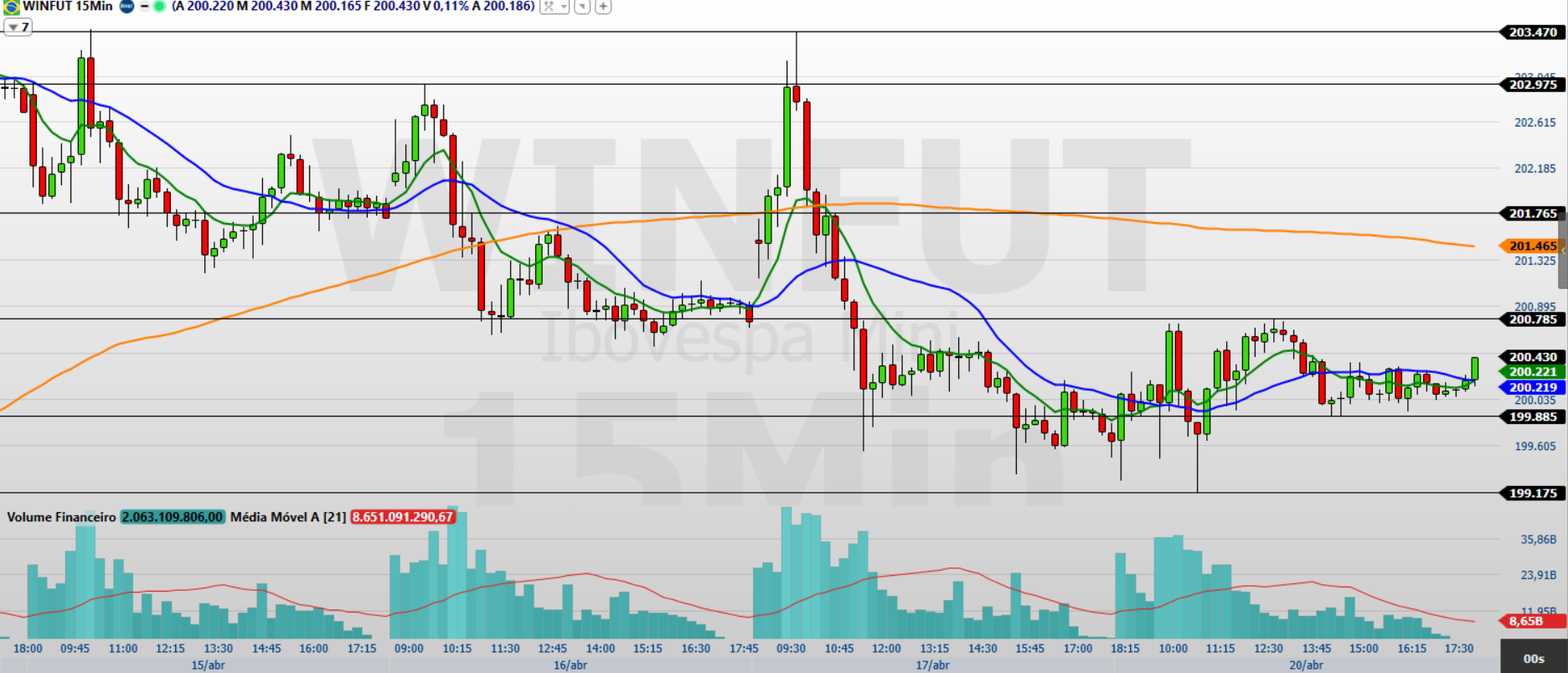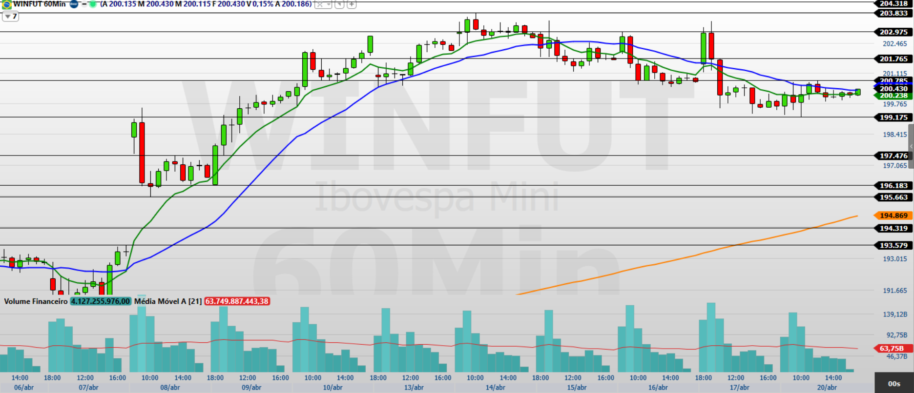 Os contratos de mini-índice (WINM26) encerraram a última sessão (20/04) com valorização de 0,39%, aos 200.430 pontos, em movimento de recuperação após as quedas recentes. O Ibovespa voltou a subir e encerrou aos 196.132 pontos, interrompendo uma sequência de três quedas, em um pregão de recuperação mesmo diante do aumento das tensões no Oriente Médio. No exterior, os índices em Wall Street recuaram levemente após máximas recentes, enquanto o mercado segue atento ao prazo do cessar-fogo entre EUA e Irã e aos impactos sobre petróleo e apetite por risco.