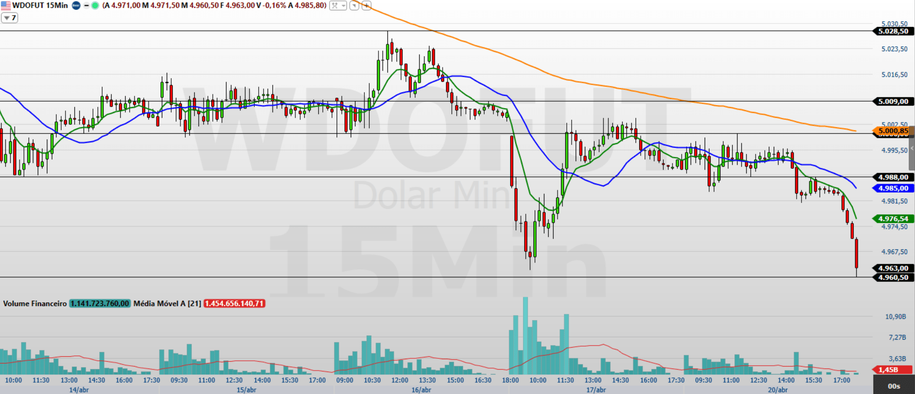 O minidólar (WDOK26) encerrou a última sessão (20/04) em queda de 0,54%, aos 4.963 pontos, mantendo a trajetória baixista e reforçando a pressão vendedora no curto prazo. O dólar operou em um ambiente mais cauteloso no cenário externo após a renovação das tensões entre EUA e Irã. A apreensão de um navio iraniano pelos norte-americanos e a suspensão de novas negociações aumentaram a busca global por ativos defensivos, reduzindo o apetite por risco.